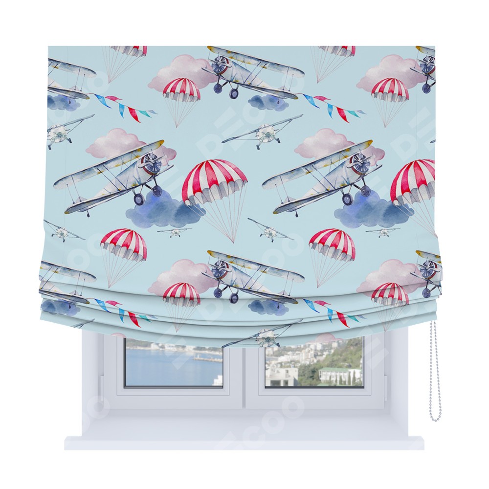 Римская штора Soft производителя «Cortin», используется для проёма, пошита из ткани блэкаут с нанесением сублимационной печати «Самолёт». Имеет универсальный механизм и подходит для монтажа: на потолок, на стену и в нишу. В отличие от стандартных римских штор, римская штора Soft не имеет горизонтальных вставок и нижнего отвеса. Это позволяет ткани произвольно драпироваться в свободные мягкие складки.