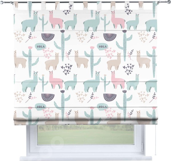 Римская штора производителя «Cortin», используется для проёма, пошита из ткани блэкаут с нанесением сублимационной печати «Милый лама». Данная модель пошита на петлях, комплектуется на выбор круглым карнизом и подходит для монтажа на стену. Римская штора на петлях имеет простую систему регулировки высоты, отличительным преимуществом данной модели является простой способ монтажа. Достаточно повесить ее на трубу и штора готова!
