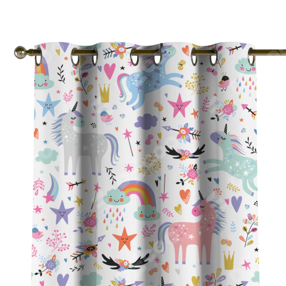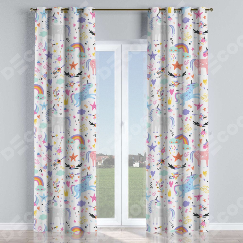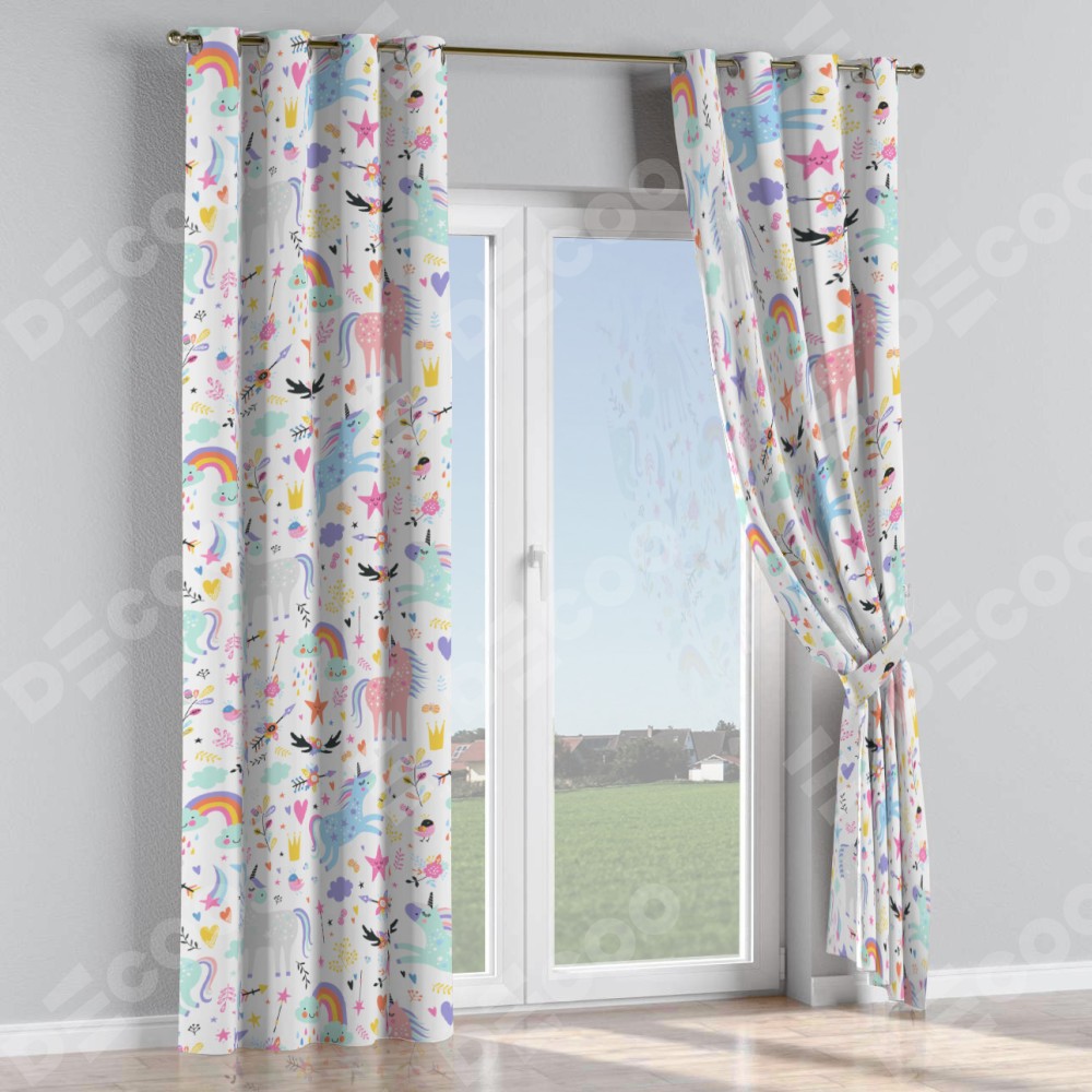Комплект прямых штор, от производителя «Cortin», пошиты из ткани блэкаут с нанесением сублимационной печати «Радужные единороги». Данная модель пошита на люверсах, комплектуется на выбор круглым карнизом и подходит для монтажа на стену или потолок. Прямые шторы на люверсах шьются по стандарту с коэффициентом 1/2 (на 100 см. ширины проёма 200 см. ширины ткани), отличительным преимуществом данной модели является простой способ монтажа. Достаточно повесить ее на трубу и штора готова!