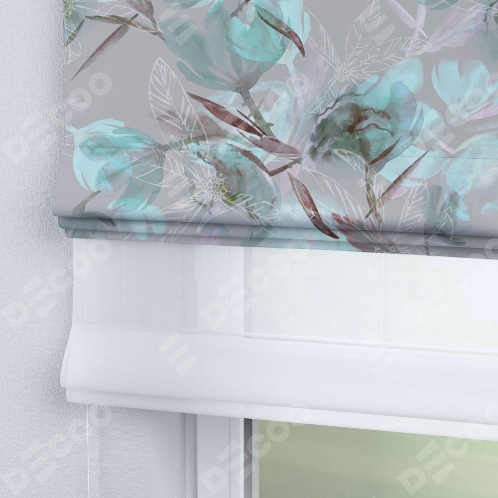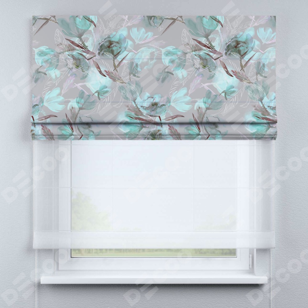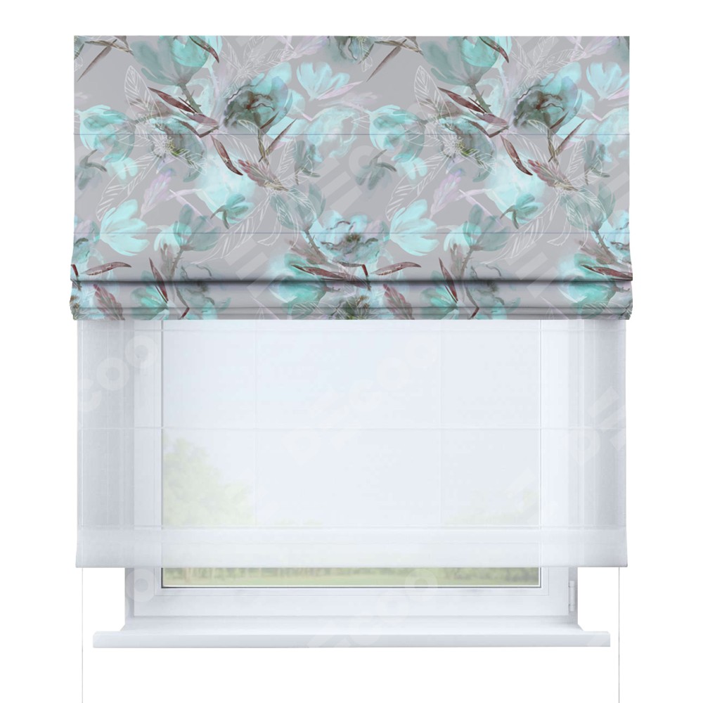 Римская штора день-ночь производителя «Cortin», используется для проёма, пошита из двух полотен, с лицевой блэкаут с нанесением сублимационной печати «Цветочная акварель», вторая ткань тюль (по стандарту комплектуется тюль белого цвета артикул V-01). Имеет универсальный механизм и подходит для монтажа: на потолок, на стену и в нишу.