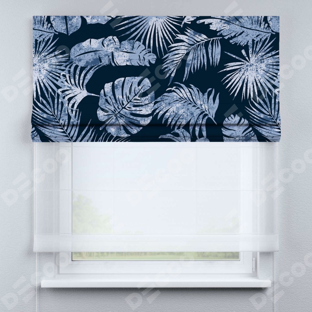Римская штора день-ночь производителя «Cortin», используется для проёма, пошита из двух полотен, с лицевой блэкаут с нанесением сублимационной печати «Тропическая ночь», вторая ткань тюль (по стандарту комплектуется тюль белого цвета артикул V-01). Имеет универсальный механизм и подходит для монтажа: на потолок, на стену и в нишу.