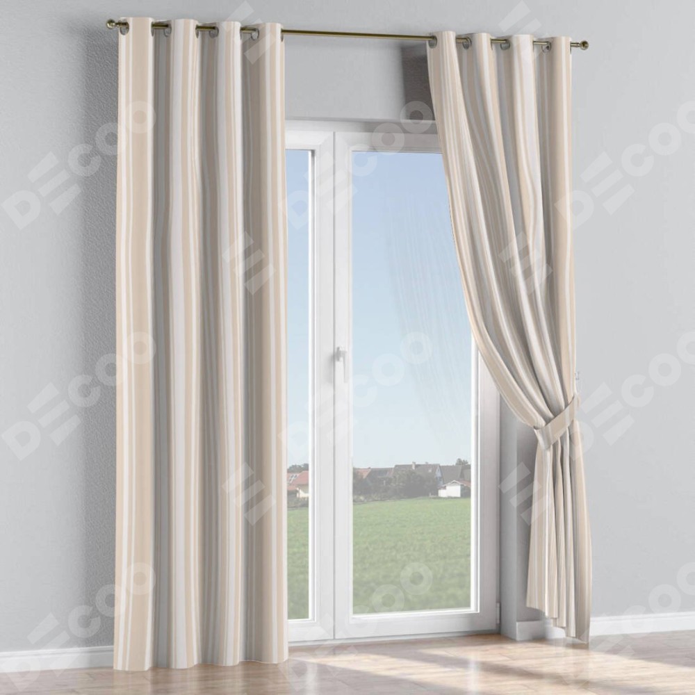 Комплект прямых штор, от производителя «Cortin», пошиты из ткани блэкаут с нанесением сублимационной печати «Бежевые вертикальные полоски». Данная модель пошита на люверсах, комплектуется на выбор круглым карнизом и подходит для монтажа на стену или потолок. Прямые шторы на люверсах шьются по стандарту с коэффициентом 1/2 (на 100 см. ширины проёма 200 см. ширины ткани), отличительным преимуществом данной модели является простой способ монтажа. Достаточно повесить ее на трубу и штора готова!