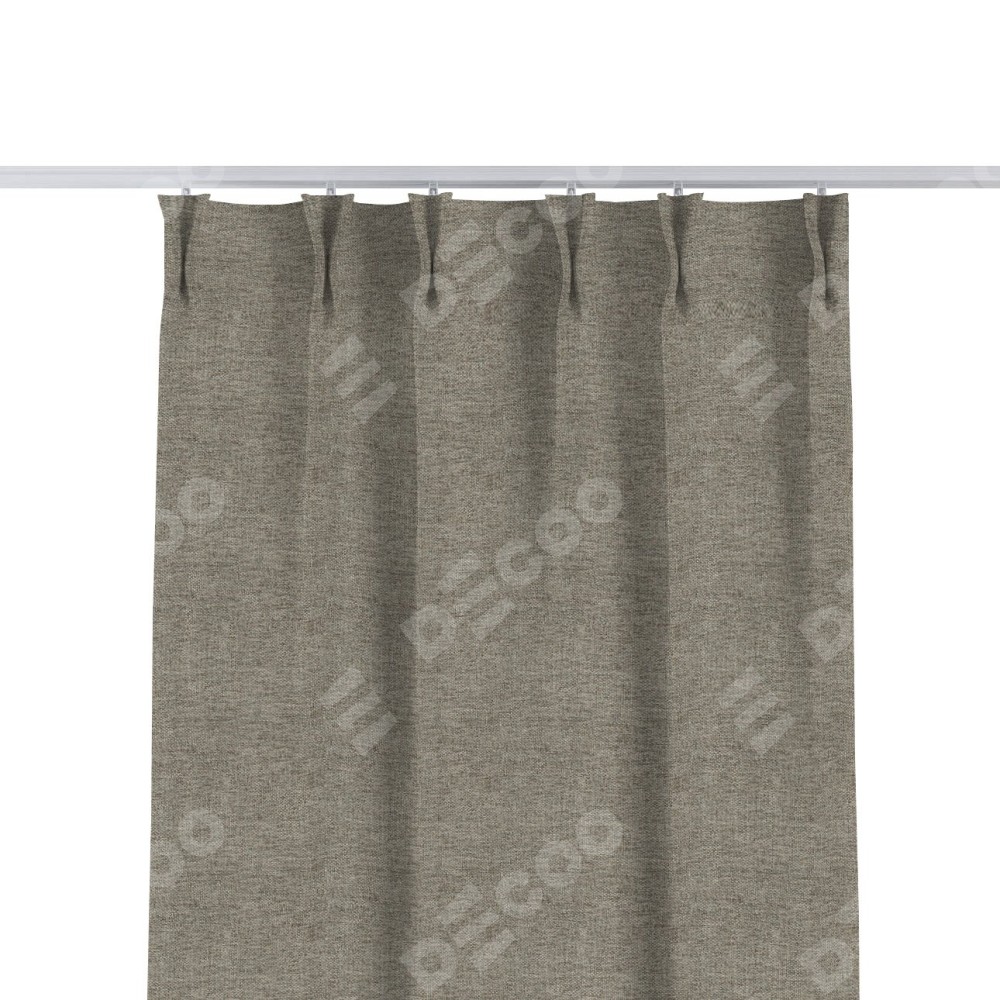 Комплект прямых штор, от производителя «Cortin», пошиты из ткани стиф димаут серо-коричневый, артикул ткани 44028. С изнаночной стороны в верхней части штор пристрачивается шторная лента с декоративными складками «Кустик». Для создания элегантных складок прямые шторы шьются по стандарту с коэффициентом 1:2 (на 100 см. ширины проёма 200 см. ширины ткани).