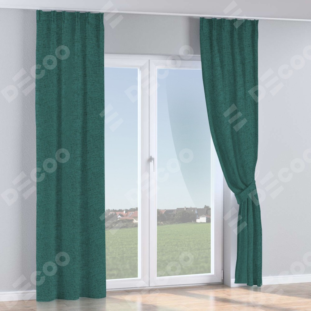 Комплект прямых штор, от производителя «Cortin», пошиты из ткани стиф димаут сине-зелёный, артикул ткани 18194. С изнаночной стороны в верхней части штор пристрачивается шторная лента с декоративными складками «Кустик». Для создания элегантных складок прямые шторы шьются по стандарту с коэффициентом 1:2 (на 100 см. ширины проёма 200 см. ширины ткани).