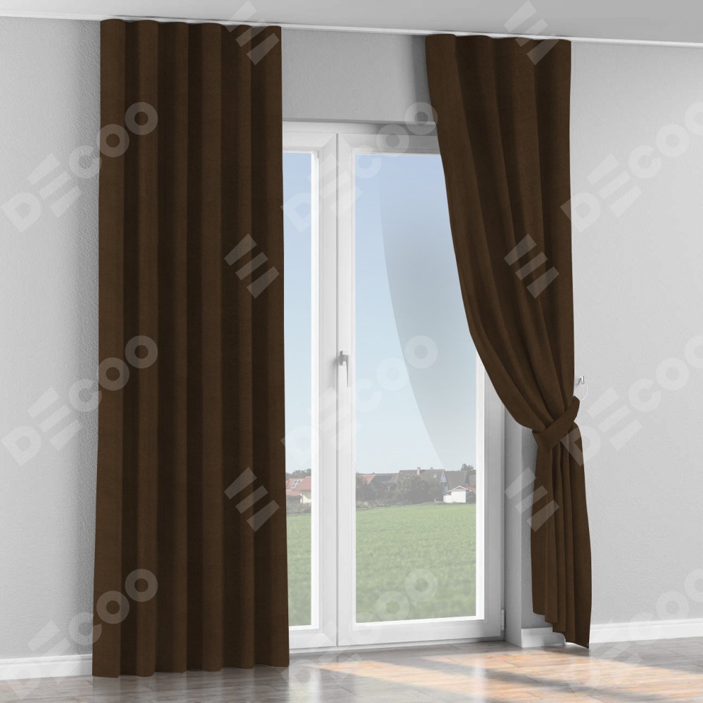 Комплект прямых штор, от производителя «Cortin», пошиты из ткани вельвет тёмно-коричневый, артикул ткани 30991. С изнаночной стороны в верхней части штор пристрачивается шторная лента с декоративными складками «Волна». Для создания элегантных складок прямые шторы шьются по стандарту с коэффициентом 1:2 (на 100 см. ширины проёма 200 см. ширины ткани).