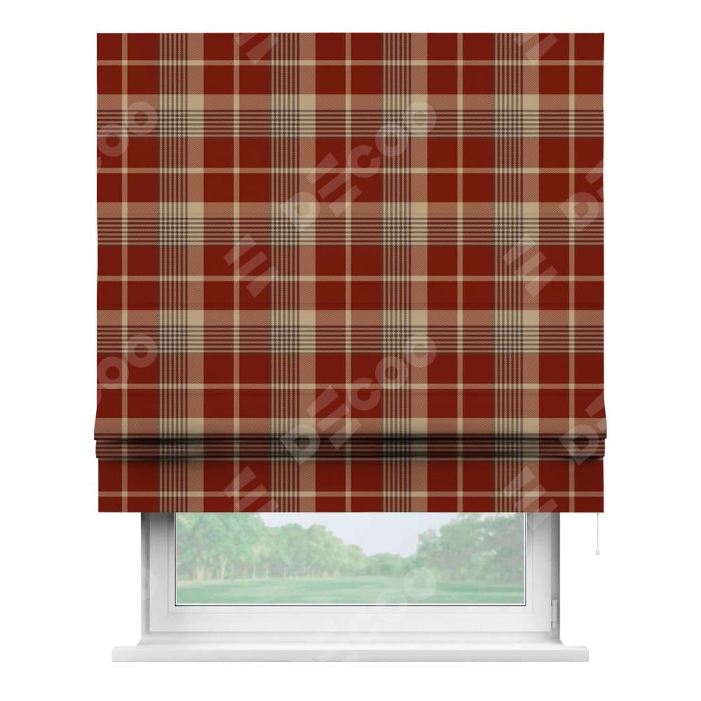 Римская штора производителя «Cortin», используется для проёма, пошита из ткани блэкаут с нанесением сублимационной печати «Бежево-бордовая клетка». Имеет универсальный механизм и подходит для монтажа: на потолок, на стену и в нишу.
