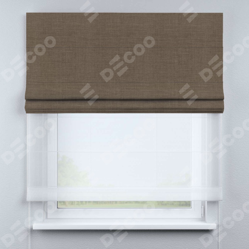 Римская штора день-ночь производителя «Cortin», используется для проёма, пошита из двух полотен, с лицевой стороны лён мокко артикул 7444, вторая ткань тюль (по стандарту комплектуется тюль белого цвета артикул V-01). Имеет универсальный механизм и подходит для монтажа: на потолок, на стену и в нишу.
