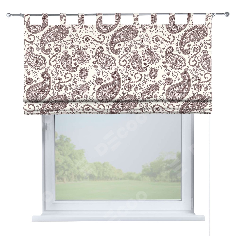 Римская штора производителя «Cortin», используется для проёма, пошита из ткани блэкаут с нанесением сублимационной печати «Индийский узор». Данная модель пошита на петлях, комплектуется на выбор круглым карнизом и подходит для монтажа на стену. Римская штора на петлях имеет простую систему регулировки высоты, отличительным преимуществом данной модели является простой способ монтажа. Достаточно повесить ее на трубу и штора готова!