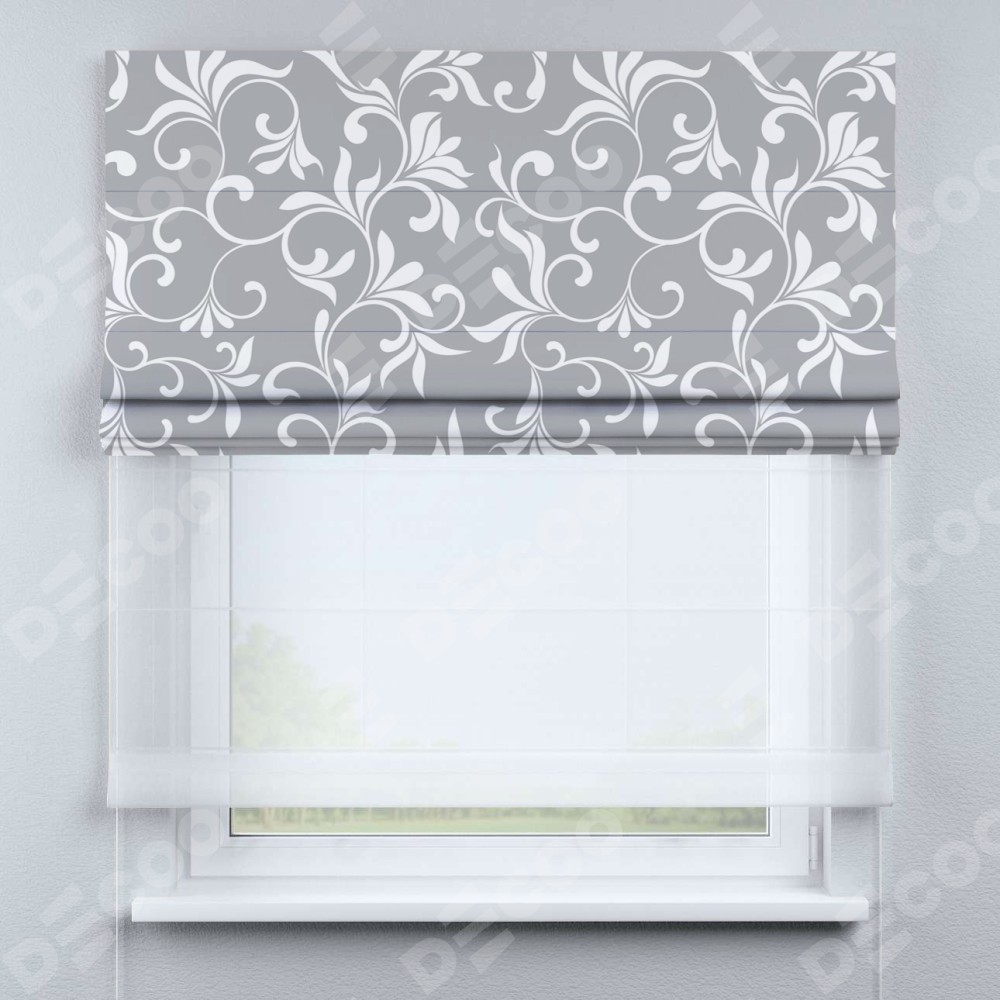 Римская штора день-ночь производителя «Cortin», используется для проёма, пошита из двух полотен, с лицевой блэкаут с нанесением сублимационной печати «Романтический узор», вторая ткань тюль (по стандарту комплектуется тюль белого цвета артикул V-01). Имеет универсальный механизм и подходит для монтажа: на потолок, на стену и в нишу.