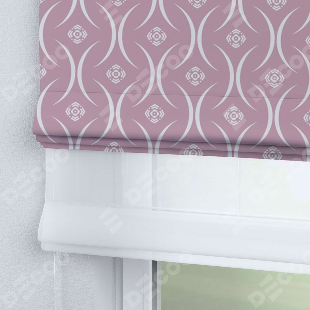 Римская штора день-ночь производителя «Cortin», используется для проёма, пошита из двух полотен, с лицевой блэкаут с нанесением сублимационной печати «Воздушный узор розовый», вторая ткань тюль (по стандарту комплектуется тюль белого цвета артикул V-01). Имеет универсальный механизм и подходит для монтажа: на потолок, на стену и в нишу.