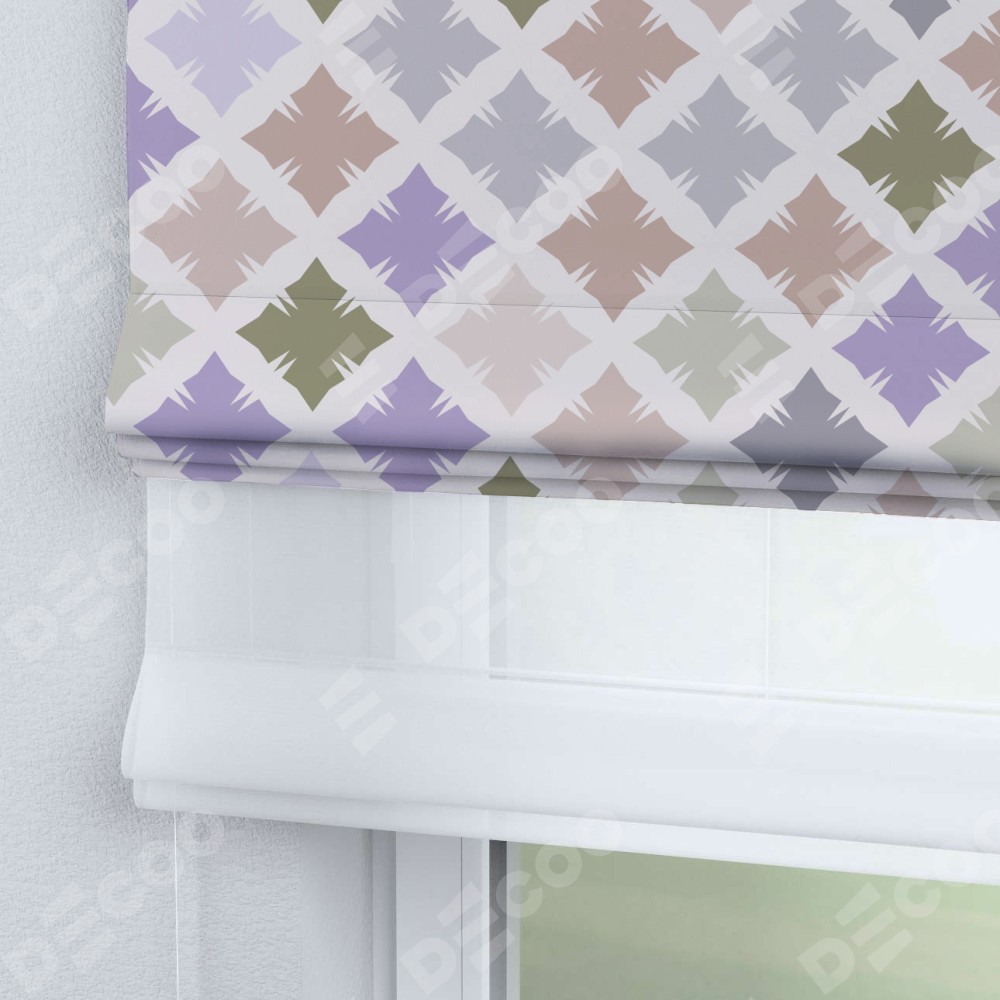 Римская штора день-ночь производителя «Cortin», используется для проёма, пошита из двух полотен, с лицевой блэкаут с нанесением сублимационной печати «Фигурные плитки», вторая ткань тюль (по стандарту комплектуется тюль белого цвета артикул V-01). Имеет универсальный механизм и подходит для монтажа: на потолок, на стену и в нишу.