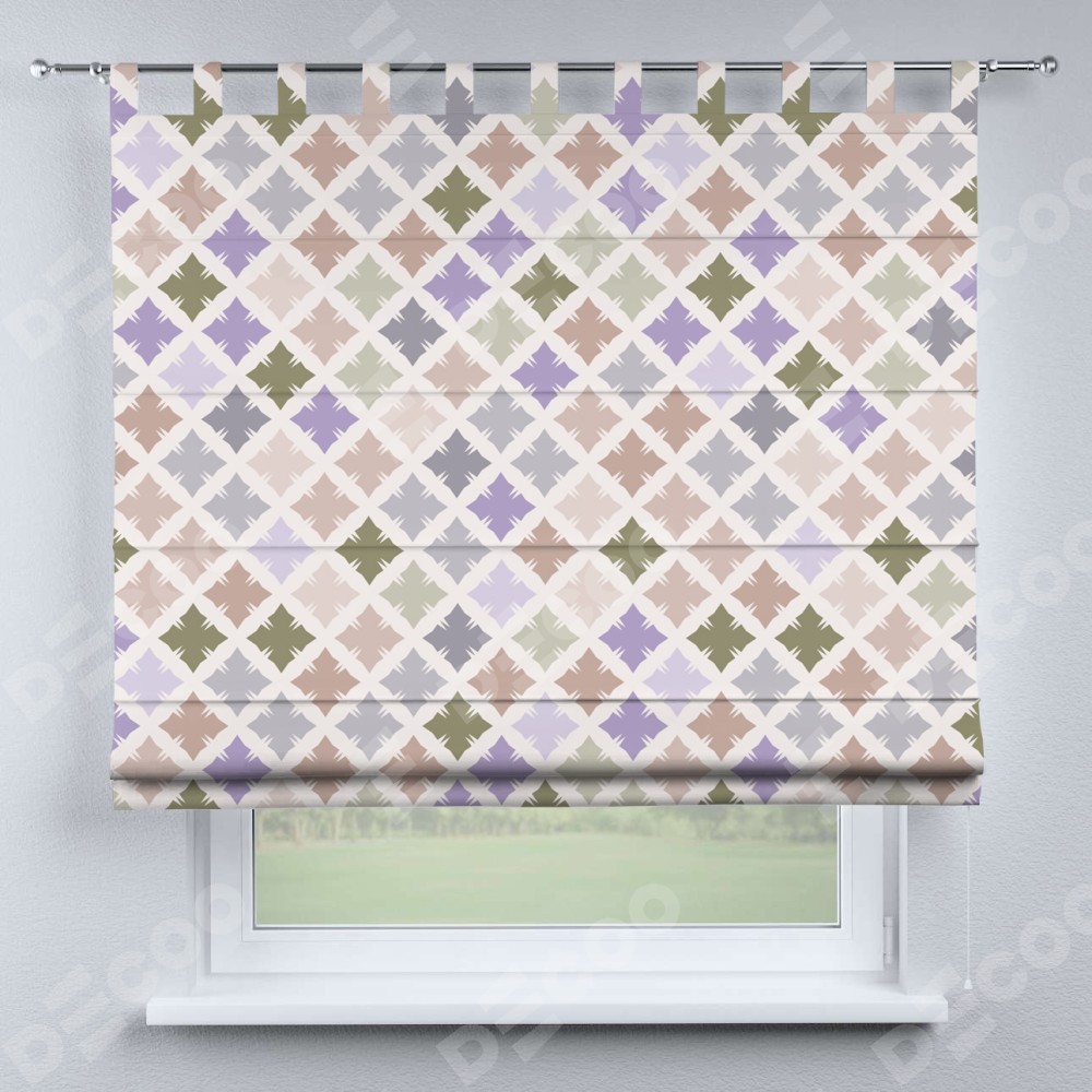 Римская штора производителя «Cortin», используется для проёма, пошита из ткани блэкаут с нанесением сублимационной печати «Фигурные плитки». Данная модель пошита на петлях, комплектуется на выбор круглым карнизом и подходит для монтажа на стену. Римская штора на петлях имеет простую систему регулировки высоты, отличительным преимуществом данной модели является простой способ монтажа. Достаточно повесить ее на трубу и штора готова!