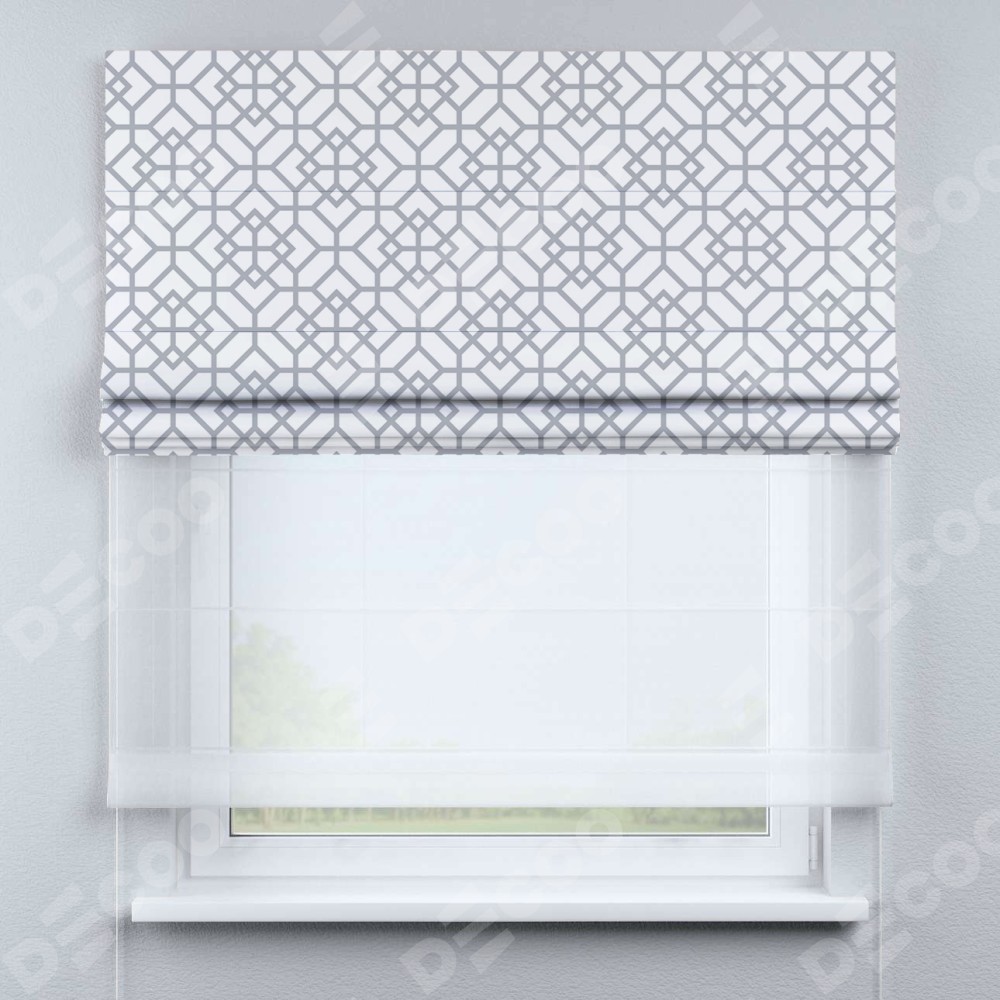Римская штора день-ночь производителя «Cortin», используется для проёма, пошита из двух полотен, с лицевой блэкаут с нанесением сублимационной печати «Архитектурный орнамент», вторая ткань тюль (по стандарту комплектуется тюль белого цвета артикул V-01). Имеет универсальный механизм и подходит для монтажа: на потолок, на стену и в нишу.