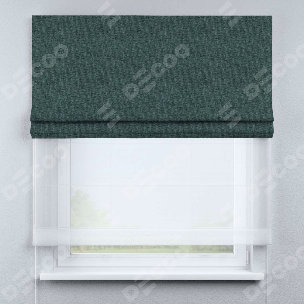Римская штора день-ночь производителя «Cortin», используется для проёма, пошита из двух полотен, с лицевой стороны стиф димаут сине-зелёный артикул 18194, вторая ткань тюль (по стандарту комплектуется тюль белого цвета артикул V-01). Имеет универсальный механизм и подходит для монтажа: на потолок, на стену и в нишу.