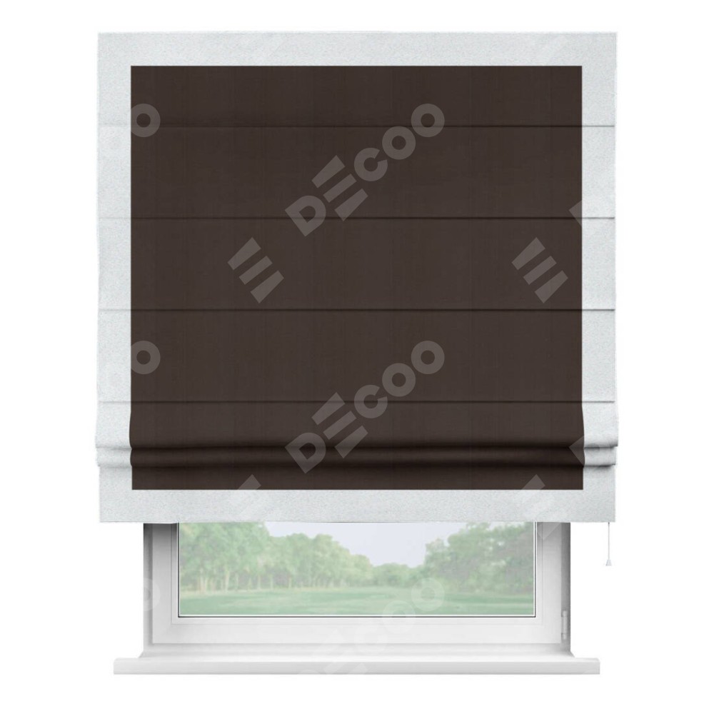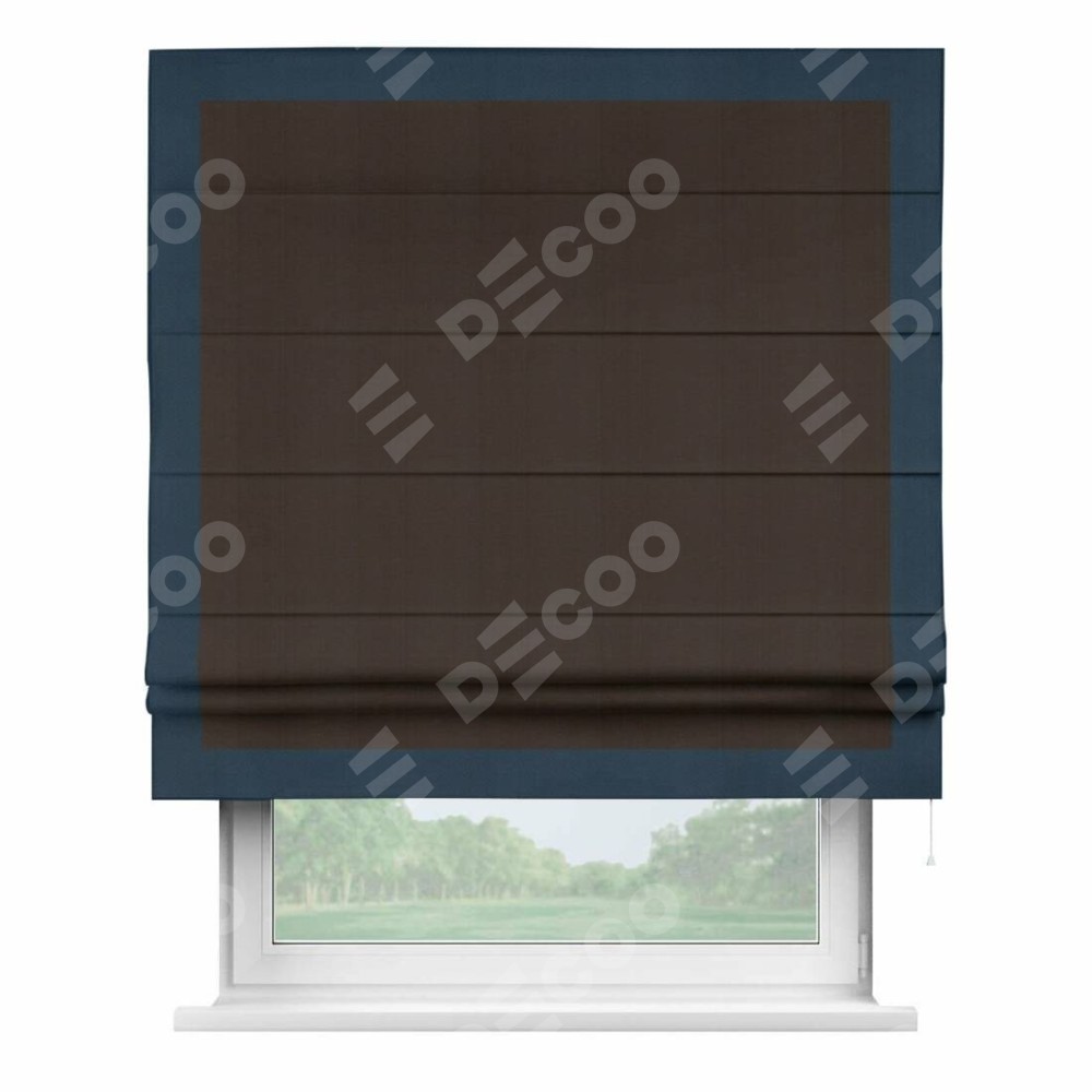 Римская штора производителя «Cortin», используется для проёма, пошита из ткани блэкаут однотонный венге, артикул ткани 88286. Отделка шторы кантом «Чесс», ткань для канта используется из блэкаута однотонного разной расцветки на выбор. Имеет универсальный механизм и подходит для монтажа: на потолок, на стену и в нишу.
