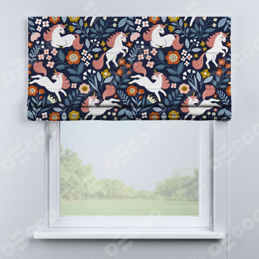 Римская штора производителя «Cortin», используется для проёма, пошита из ткани блэкаут с нанесением сублимационной печати «Цветы и единороги». Имеет универсальный механизм и подходит для монтажа: на потолок, на стену и в нишу.