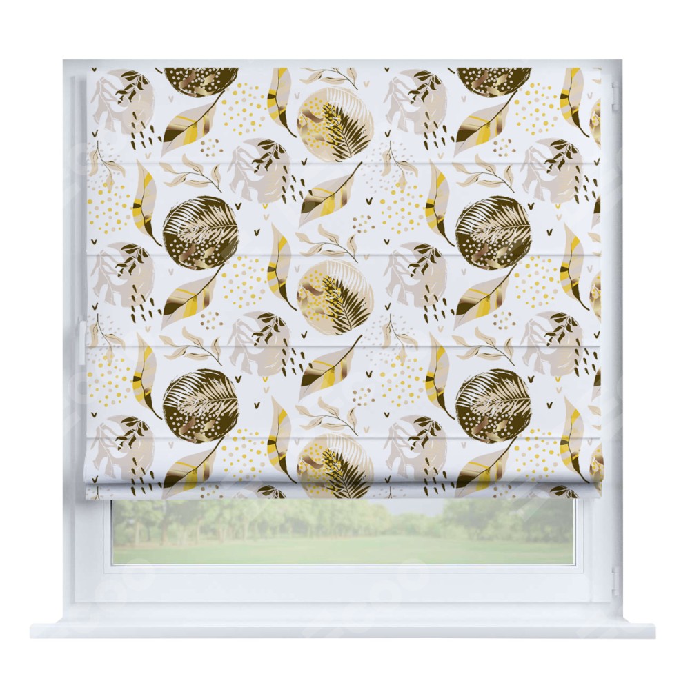Римская штора производителя «Cortin», устанавливается на створку окна, пошита из ткани блэкаут с нанесением сублимационной печати «Золотые листья». Штора шьётся по индивидуальным размерам, для данного типа римской шторы возможная ширина от 35 до 150 см., высота до 250 см.