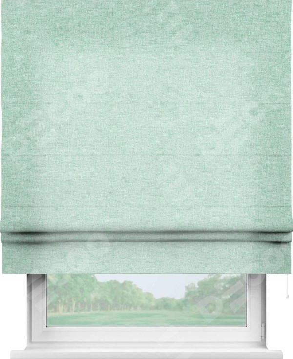 Римская штора производителя «Cortin», используется для проёма, пошита из ткани лён кашемир мятный, артикул ткани 21617. Имеет универсальный механизм и подходит для монтажа: на потолок, на стену и в нишу.