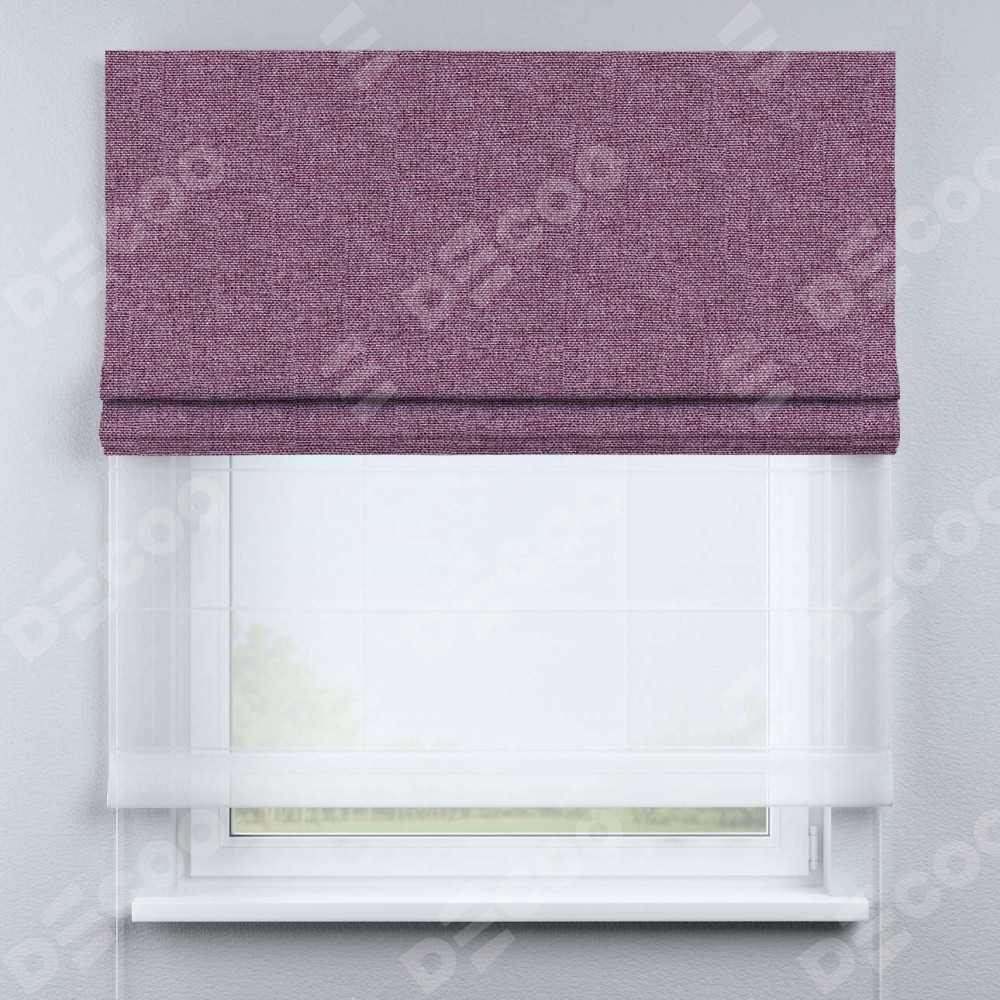 Римская штора день-ночь производителя «Cortin», используется для проёма, пошита из двух полотен, с лицевой стороны лён кашемир сиреневый артикул 21620, вторая ткань тюль (по стандарту комплектуется тюль белого цвета артикул V-01). Имеет универсальный механизм и подходит для монтажа: на потолок, на стену и в нишу.