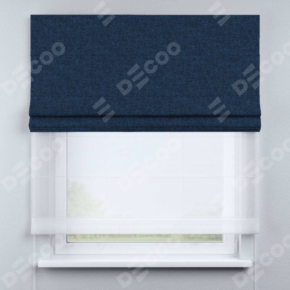 Римская штора день-ночь производителя «Cortin», используется для проёма, пошита из двух полотен, с лицевой стороны лён кашемир тёмно-синий артикул 17215, вторая ткань тюль (по стандарту комплектуется тюль белого цвета артикул V-01). Имеет универсальный механизм и подходит для монтажа: на потолок, на стену и в нишу.