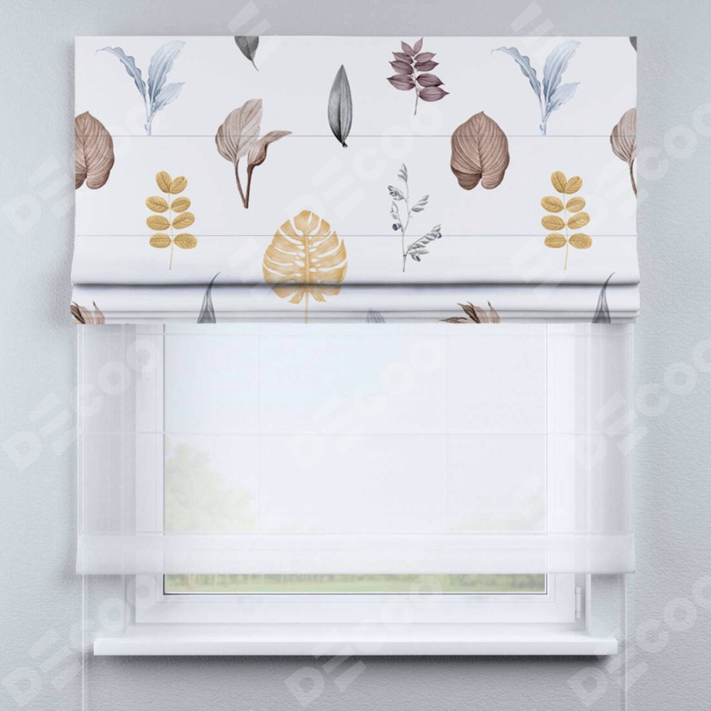 Римская штора день-ночь производителя «Cortin», используется для проёма, пошита из двух полотен, с лицевой блэкаут с нанесением сублимационной печати «Осенний коллаж», вторая ткань тюль (по стандарту комплектуется тюль белого цвета артикул V-01). Имеет универсальный механизм и подходит для монтажа: на потолок, на стену и в нишу.