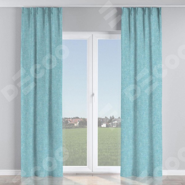 Комплект прямых штор, от производителя «Cortin», пошиты из ткани лён кашемир голубой, артикул ткани 21616. С изнаночной стороны в верхней части штор пристрачивается шторная лента с декоративными складками «Кустик». Для создания элегантных складок прямые шторы шьются по стандарту с коэффициентом 1:2 (на 100 см. ширины проёма 200 см. ширины ткани).