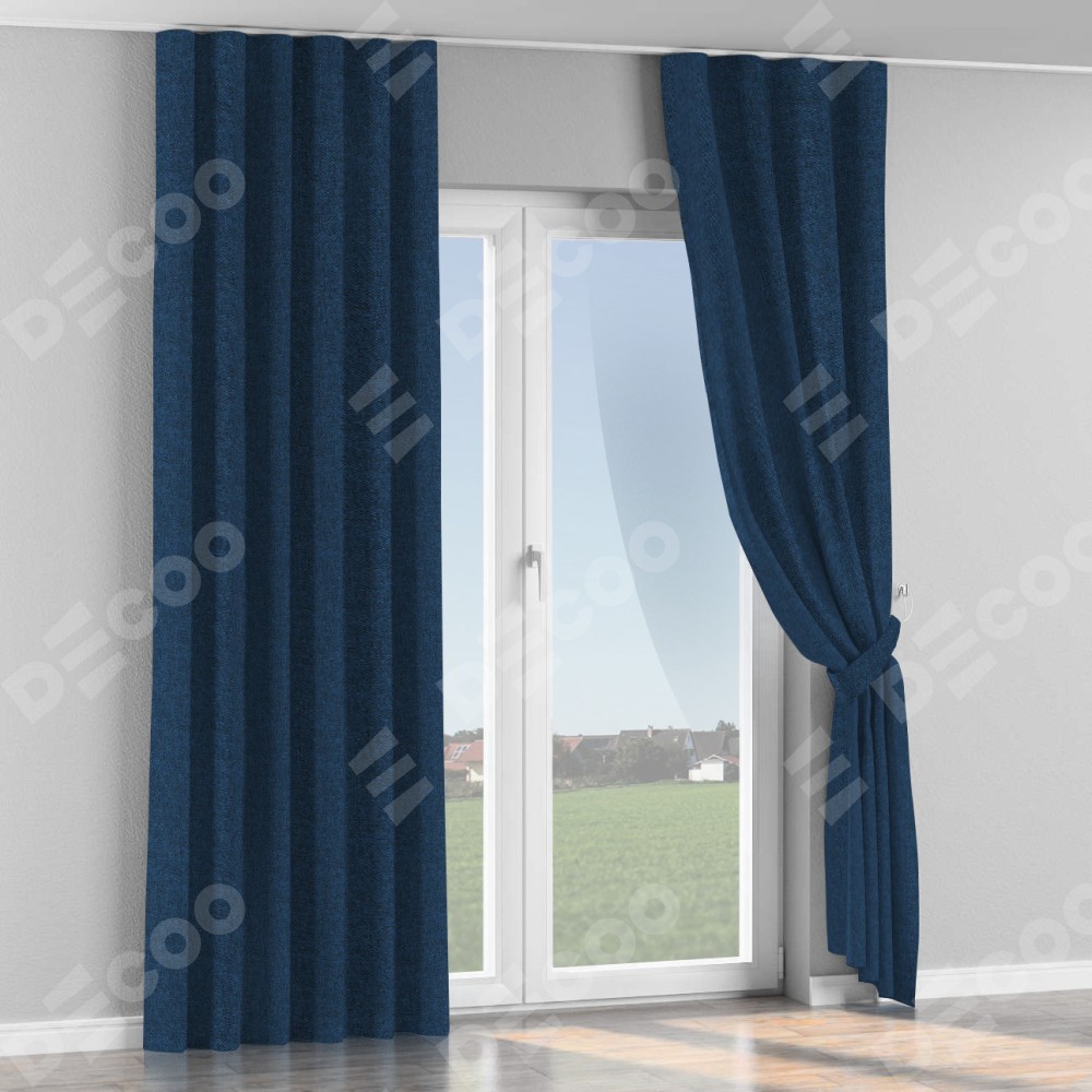 Комплект прямых штор, от производителя «Cortin», пошиты из ткани лён кашемир тёмно-синий, артикул ткани 17215. С изнаночной стороны в верхней части штор пристрачивается шторная лента с декоративными складками «Волна». Для создания элегантных складок прямые шторы шьются по стандарту с коэффициентом 1:2 (на 100 см. ширины проёма 200 см. ширины ткани).