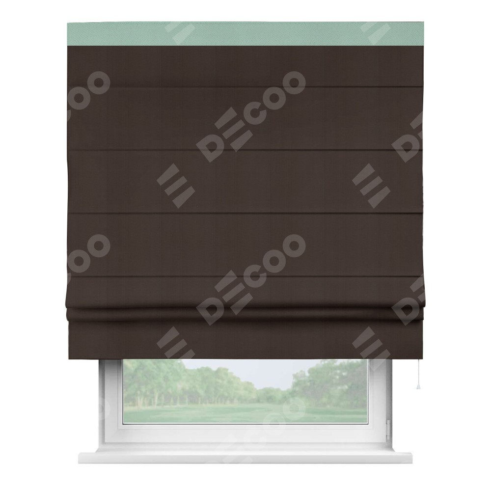 Римская штора производителя «Cortin», используется для проёма, пошита из ткани блэкаут однотонный тёмно-коричневый, артикул ткани 88287. Отделка шторы кантом «Кинг», ткань для канта используется из блэкаута однотонного разной расцветки на выбор. Имеет универсальный механизм и подходит для монтажа: на потолок, на стену и в нишу.
