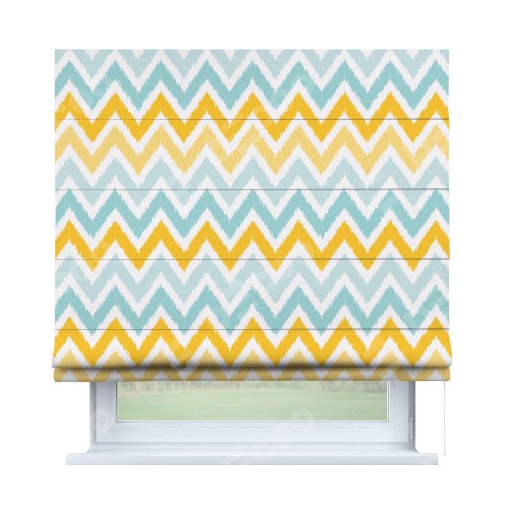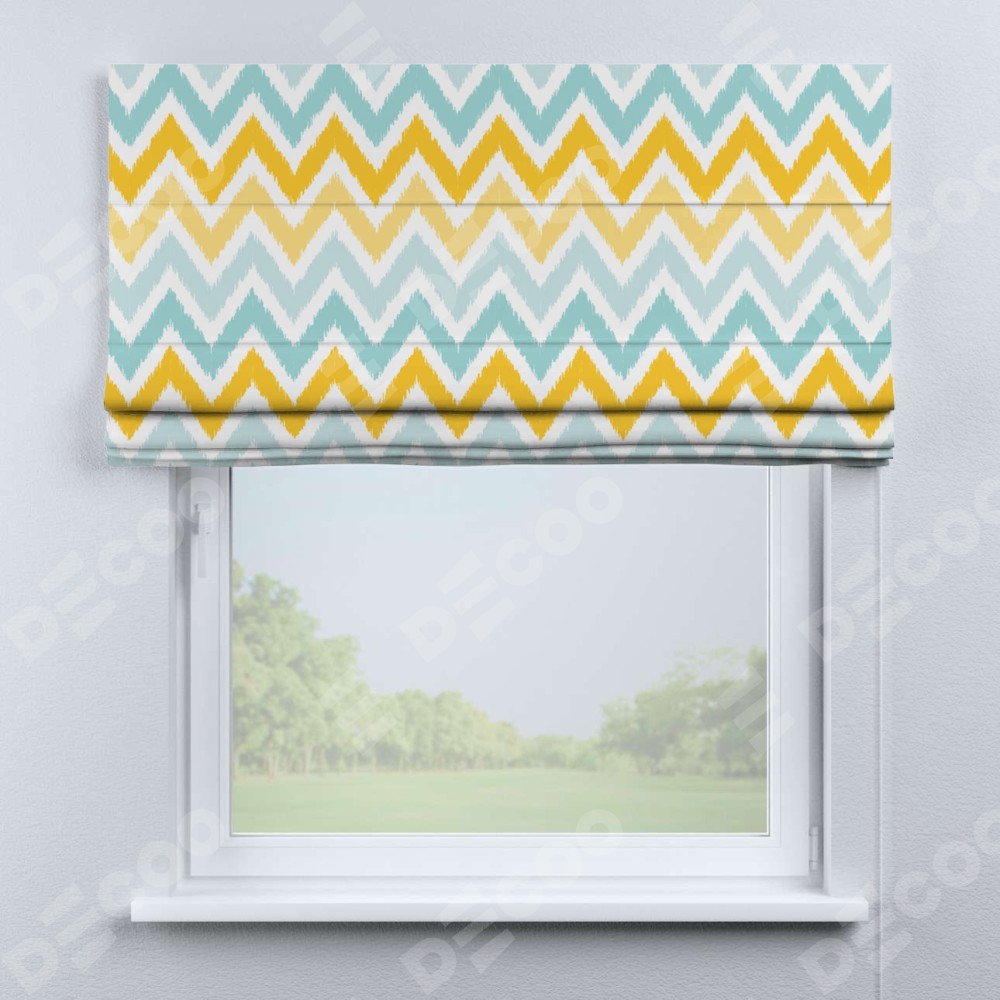 Римская штора производителя «Cortin», используется для проёма, пошита из ткани блэкаут с нанесением сублимационной печати «Икат шеврон». Имеет универсальный механизм и подходит для монтажа: на потолок, на стену и в нишу.