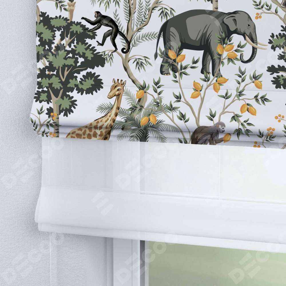 Римская штора день-ночь производителя «Cortin», используется для проёма, пошита из двух полотен, с лицевой блэкаут с нанесением сублимационной печати «Африканские равнины», вторая ткань тюль (по стандарту комплектуется тюль белого цвета артикул V-01). Имеет универсальный механизм и подходит для монтажа: на потолок, на стену и в нишу.