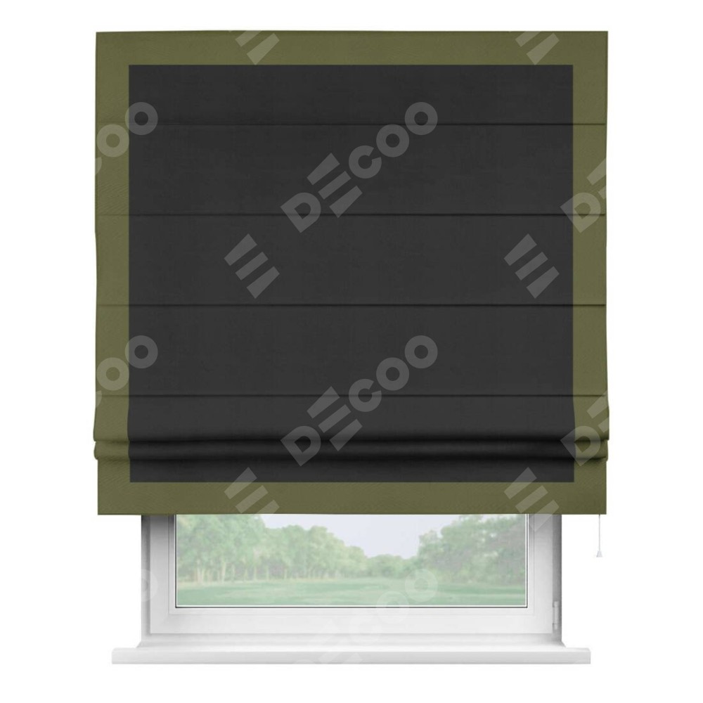 Римская штора производителя «Cortin», используется для проёма, пошита из ткани блэкаут однотонный черный, артикул ткани 79904. Отделка шторы кантом «Чесс», ткань для канта используется из блэкаута однотонного разной расцветки на выбор. Имеет универсальный механизм и подходит для монтажа: на потолок, на стену и в нишу.