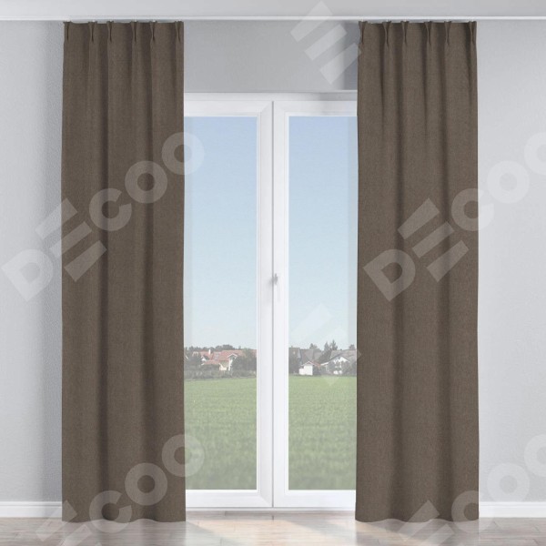 Комплект прямых штор, от производителя «Cortin», пошиты из ткани лён блэкаут коричневый, артикул ткани 69383. С изнаночной стороны в верхней части штор пристрачивается шторная лента с декоративными складками «Кустик». Для создания элегантных складок прямые шторы шьются по стандарту с коэффициентом 1:2 (на 100 см. ширины проёма 200 см. ширины ткани).