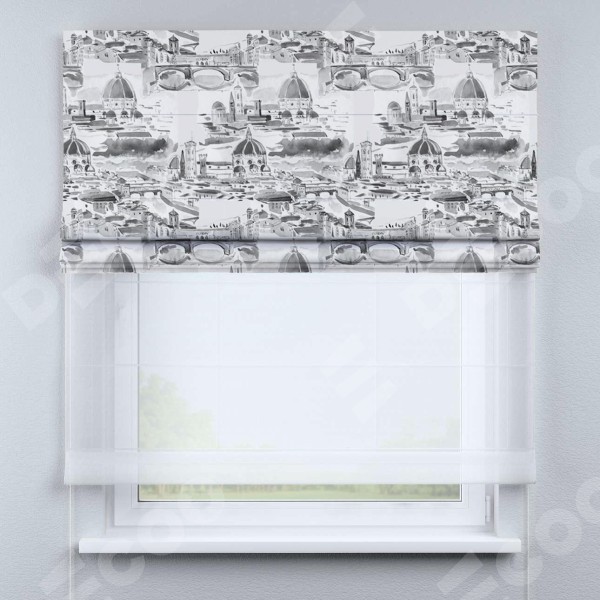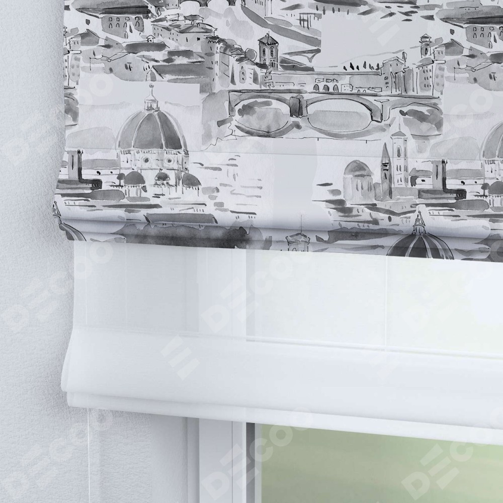 Римская штора день-ночь производителя «Cortin», используется для проёма, пошита из двух полотен, с лицевой блэкаут с нанесением сублимационной печати «Старый город», вторая ткань тюль (по стандарту комплектуется тюль белого цвета артикул V-01). Имеет универсальный механизм и подходит для монтажа: на потолок, на стену и в нишу.