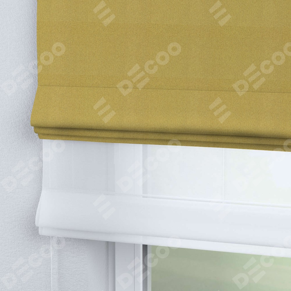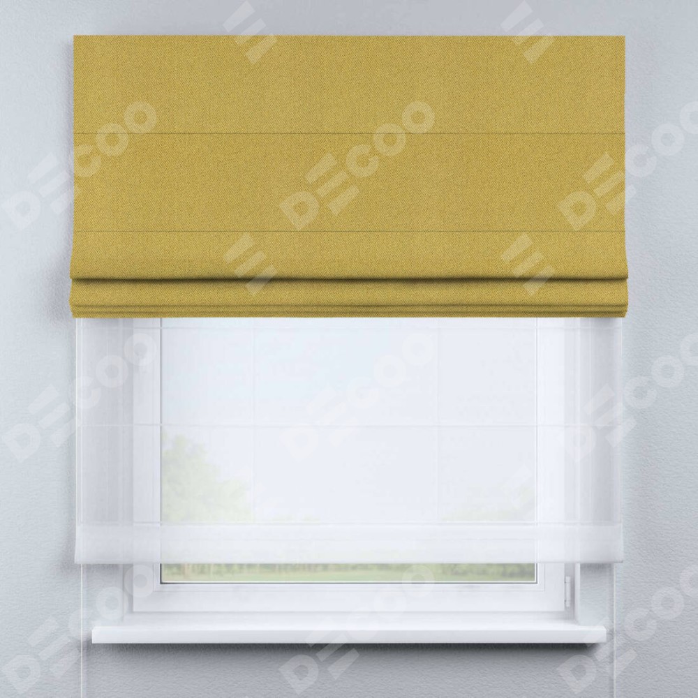 Римская штора день-ночь производителя «Cortin», используется для проёма, пошита из двух полотен, с лицевой стороны твид блэкаут пыльная горчица артикул 21588, вторая ткань тюль (по стандарту комплектуется тюль белого цвета артикул V-01). Имеет универсальный механизм и подходит для монтажа: на потолок, на стену и в нишу.