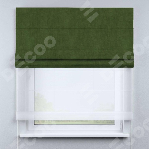 Римская штора день-ночь производителя «Cortin», используется для проёма, пошита из двух полотен, с лицевой стороны вельвет тёмно-салатовый артикул 33805, вторая ткань тюль (по стандарту комплектуется тюль белого цвета артикул V-01). Имеет универсальный механизм и подходит для монтажа: на потолок, на стену и в нишу.