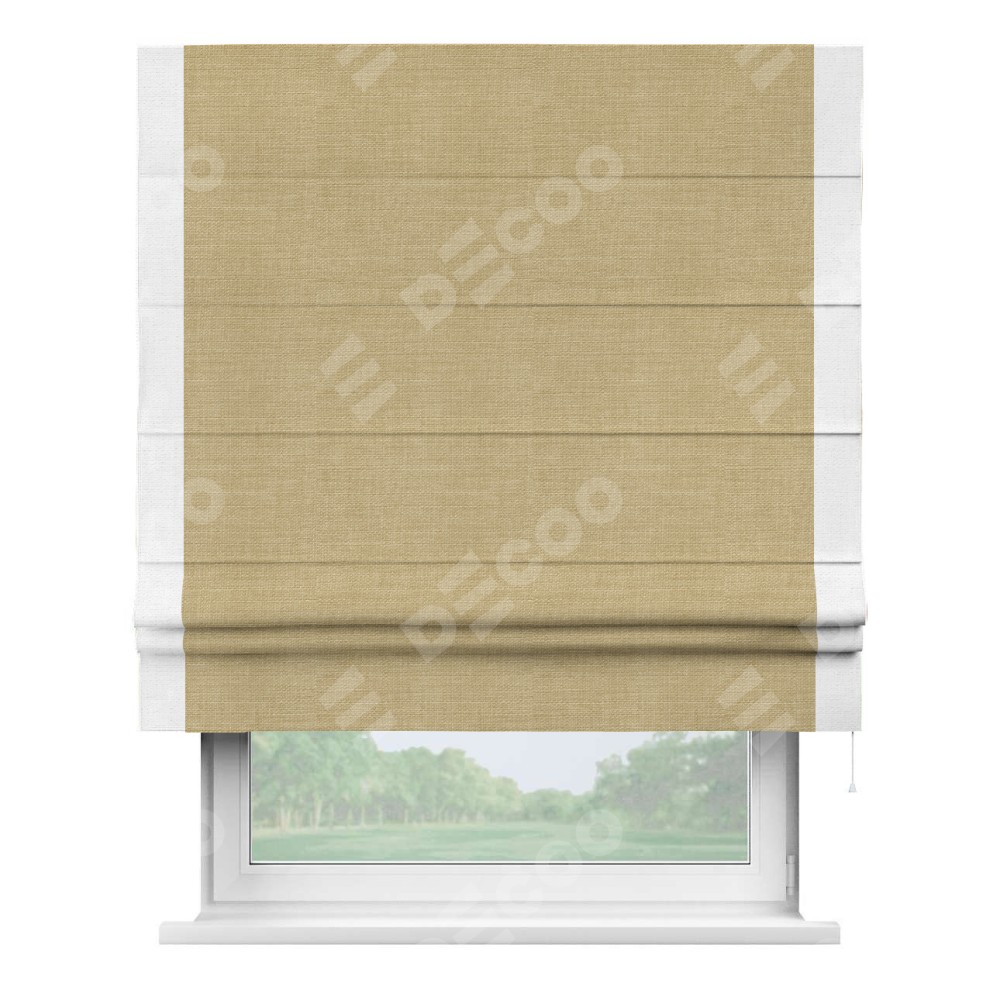 Римская штора производителя «Cortin», используется для проёма, пошита из ткани лён бежевый, артикул 7442. Отделка шторы кантом «Стрим Дуо», ткань для канта используется из льна разной расцветки на выбор. Имеет универсальный механизм и подходит для монтажа: на потолок, на стену и в нишу.