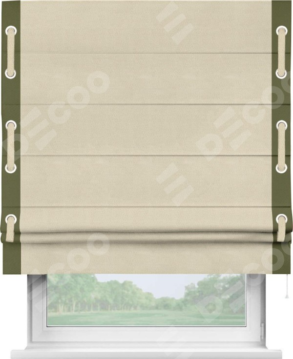 Римская штора производителя «Cortin», используется для проёма, пошита из ткани блэкаут однотонный бежевый, артикул ткани 13125. Отделка шторы кантом «Стрим Дуо» на кантах расположены люверсы с пояском, ткань для канта используется из блэкаута однотонного разной расцветки на выбор. Ткань для пояска обычно используется из основной ткани шторы, а так же можно сделать из любой расцветки по желанию. Имеет универсальный механизм и подходит для монтажа: на потолок, на стену и в нишу.