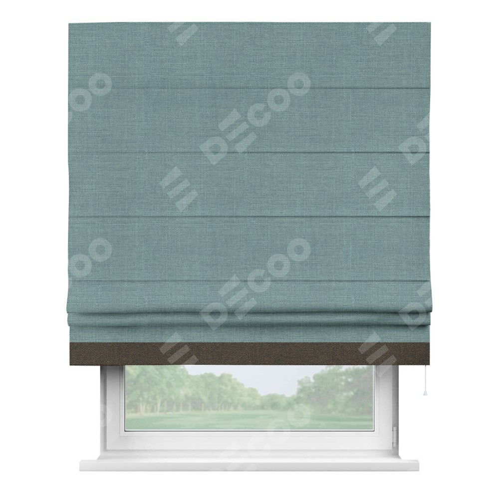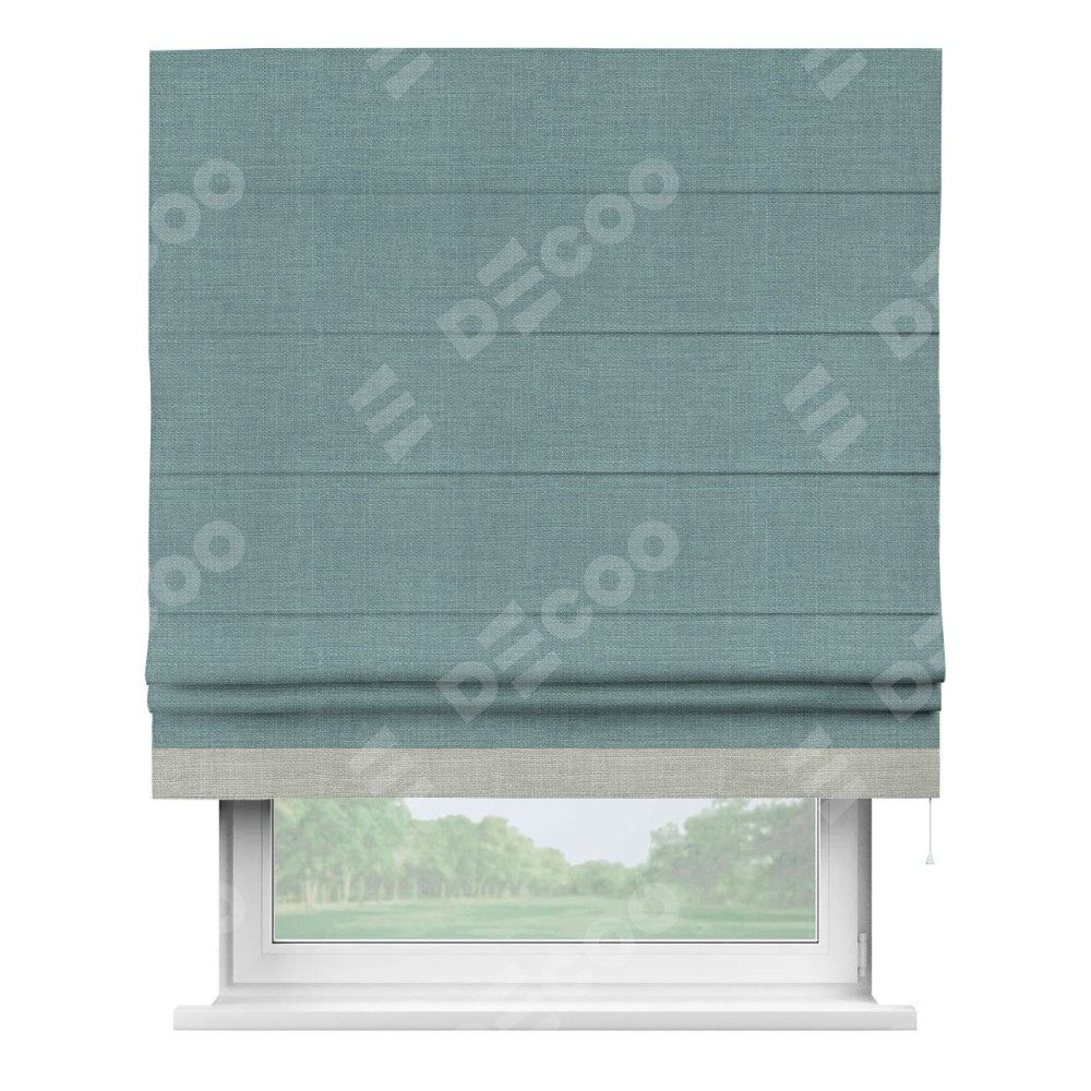 Римская штора производителя «Cortin», используется для проёма, пошита из ткани лён голубой, артикул 74736. Отделка шторы кантом «Джестер», ткань для канта используется из льна разной расцветки на выбор. Имеет универсальный механизм и подходит для монтажа: на потолок, на стену и в нишу.
