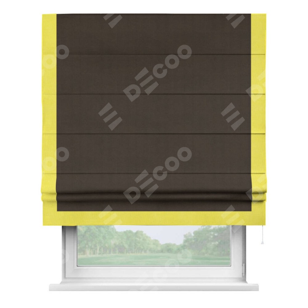 Римская штора производителя «Cortin», используется для проёма, пошита из ткани вельвет тёмно-коричневый, артикул ткани 30991. Отделка шторы кантом «Виктория», ткань для канта используется из вельвета разной расцветки на выбор. Имеет универсальный механизм и подходит для монтажа: на потолок, на стену и в нишу.