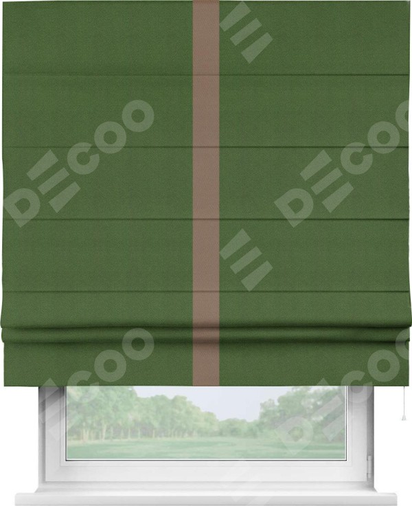 Римская штора производителя «Cortin», используется для проёма, пошита из ткани блэкаут однотонный зелёный перламутр, артикул ткани 81859−2. Отделка шторы кантом «Хайвей», ткань для канта используется из блэкаута однотонного разной расцветки на выбор. Имеет универсальный механизм и подходит для монтажа: на потолок, на стену и в нишу.