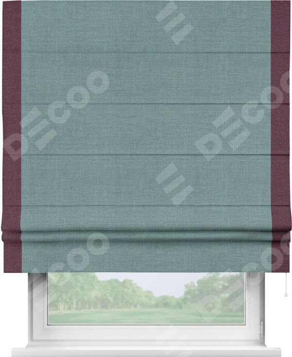 Римская штора производителя «Cortin», используется для проёма, пошита из ткани лён голубой, артикул 74736. Отделка шторы кантом «Стрим Дуо», ткань для канта используется из льна разной расцветки на выбор. Имеет универсальный механизм и подходит для монтажа: на потолок, на стену и в нишу.