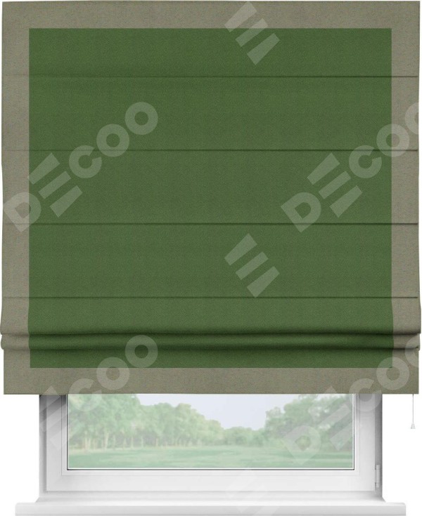 Римская штора производителя «Cortin», используется для проёма, пошита из ткани блэкаут однотонный зелёный перламутр, артикул ткани 81859−2. Отделка шторы кантом «Чесс», ткань для канта используется из блэкаута однотонного разной расцветки на выбор. Имеет универсальный механизм и подходит для монтажа: на потолок, на стену и в нишу.