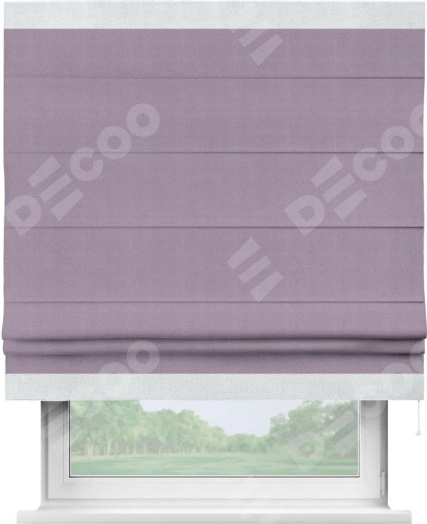 Римская штора производителя «Cortin», используется для проёма, пошита из ткани блэкаут однотонный светло-сиреневый, артикул ткани 29333−1. Отделка шторы кантом «Горизонт», ткань для канта используется из блэкаута однотонного разной расцветки на выбор. Имеет универсальный механизм и подходит для монтажа: на потолок, на стену и в нишу.