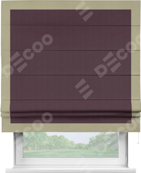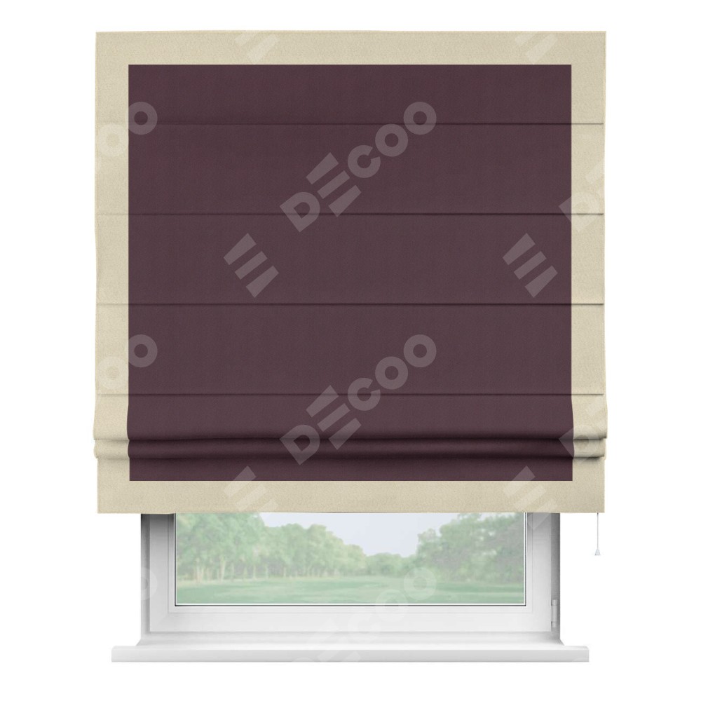 Римская штора производителя «Cortin», используется для проёма, пошита из ткани блэкаут однотонный сиреневый, артикул ткани 29333−2. Отделка шторы кантом «Чесс», ткань для канта используется из блэкаута однотонного разной расцветки на выбор. Имеет универсальный механизм и подходит для монтажа: на потолок, на стену и в нишу.