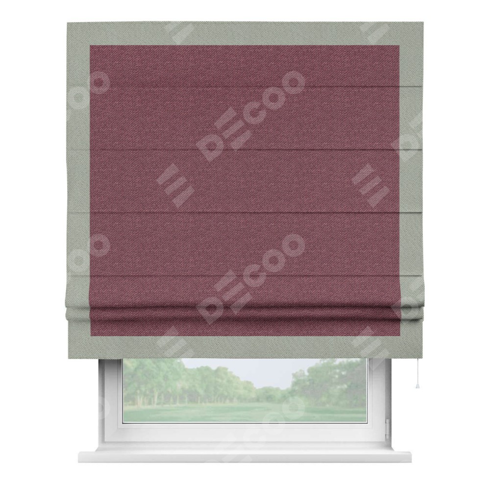 Римская штора производителя «Cortin», используется для проёма, пошита из ткани лён димаут марсала, артикул 1602. Отделка шторы кантом «Чесс», ткань для канта используется из льна димаут разной расцветки на выбор. Имеет универсальный механизм и подходит для монтажа: на потолок, на стену и в нишу.