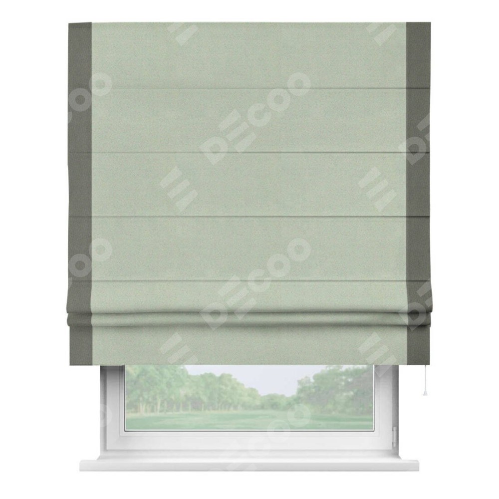 Римская штора производителя «Cortin», используется для проёма, пошита из ткани блэкаут однотонный светло-серый, артикул ткани 29332−2. Отделка шторы кантом «Стрим Дуо», ткань для канта используется из блэкаута однотонного разной расцветки на выбор. Имеет универсальный механизм и подходит для монтажа: на потолок, на стену и в нишу.