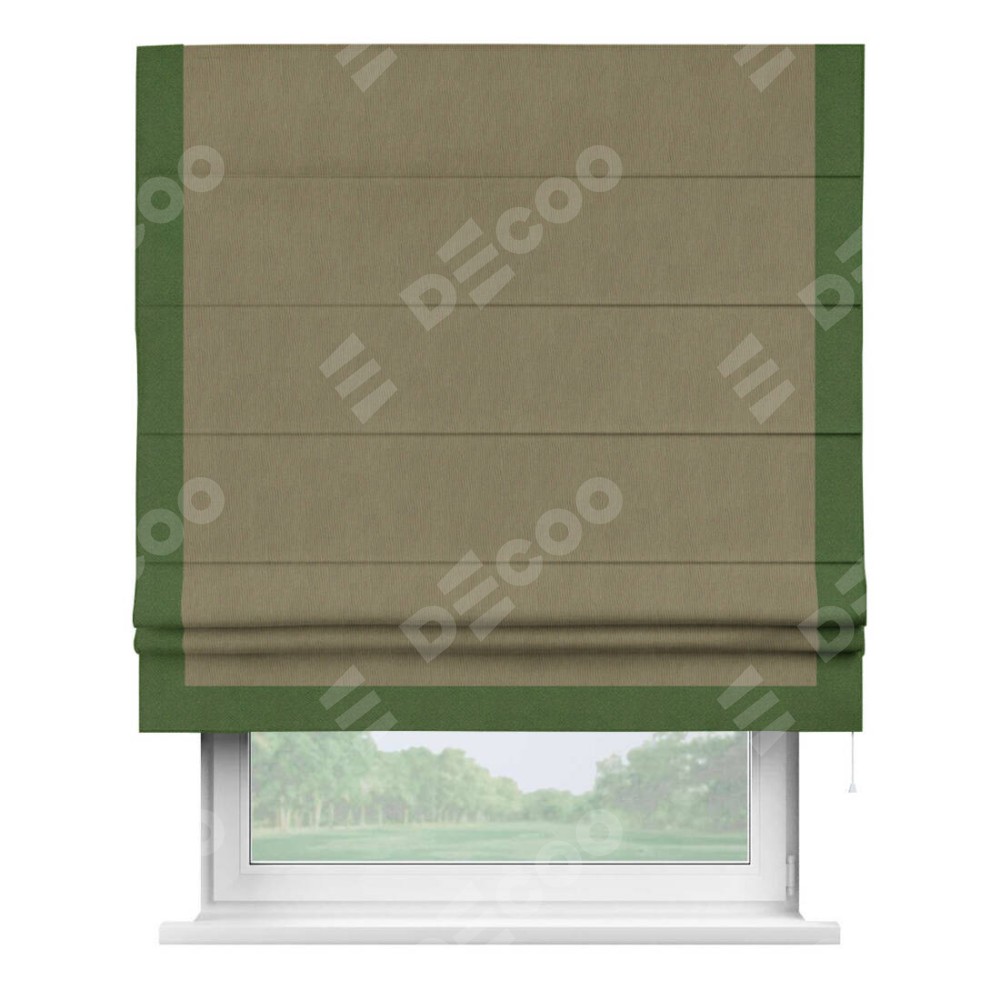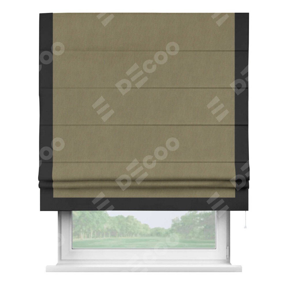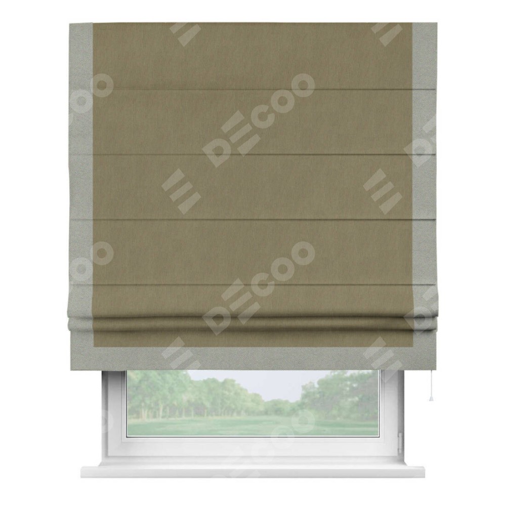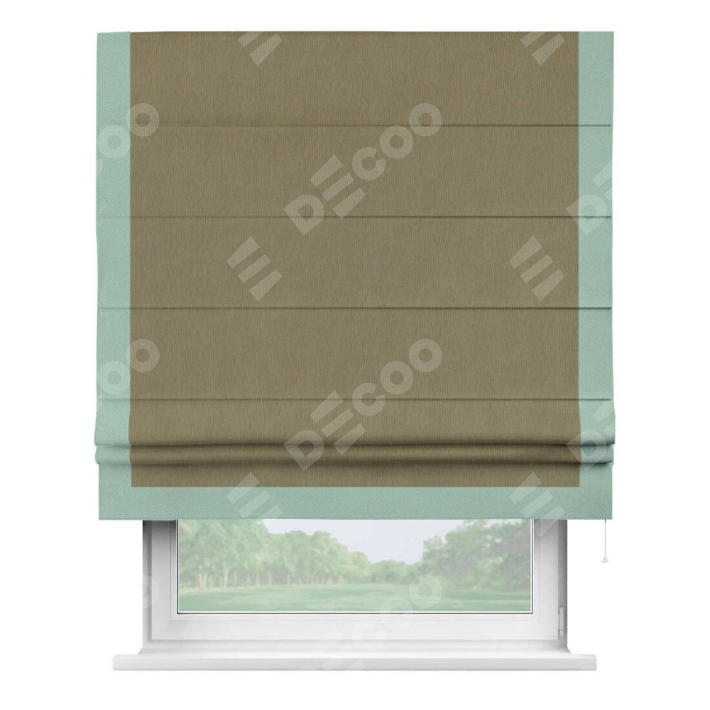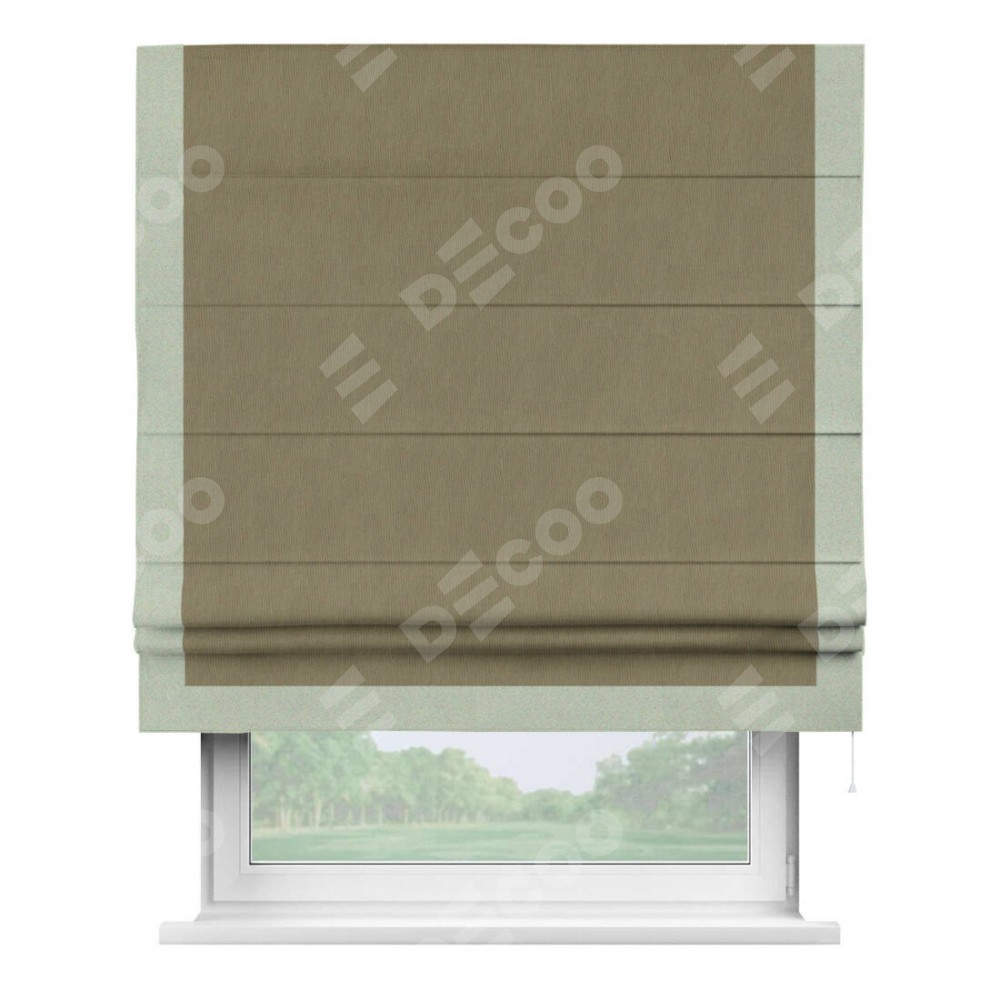 Римская штора производителя «Cortin», используется для проёма, пошита из ткани блэкаут однотонный бежево-золотой, артикул ткани 12095−2. Отделка шторы кантом «Виктория», ткань для канта используется из блэкаута однотонного разной расцветки на выбор. Имеет универсальный механизм и подходит для монтажа: на потолок, на стену и в нишу.