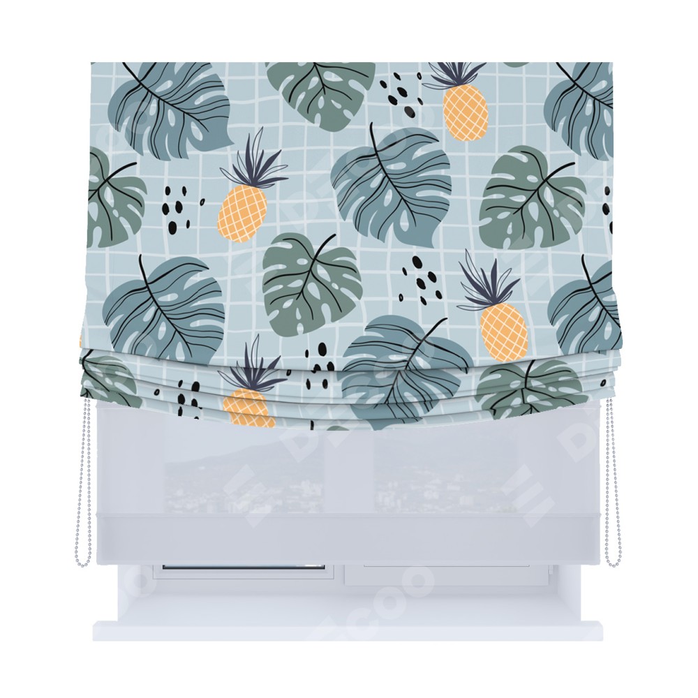 Римская штора день-ночь производителя «Cortin», используется для проёма, пошита из двух полотен, с лицевой блэкаут с нанесением сублимационной печати «Ананасы и листья монстеры», вторая ткань тюль (по стандарту комплектуется тюль белого цвета артикул V-01). Имеет универсальный механизм и подходит для монтажа: на потолок, на стену и в нишу. Удобное управление каждой шторой отдельно.