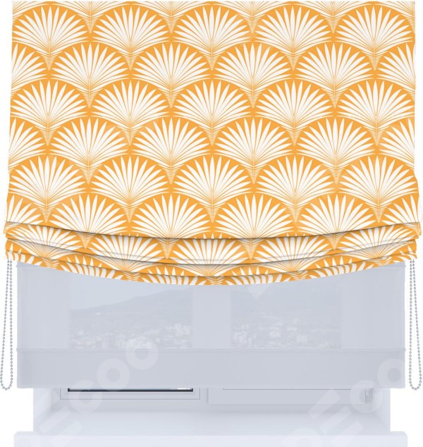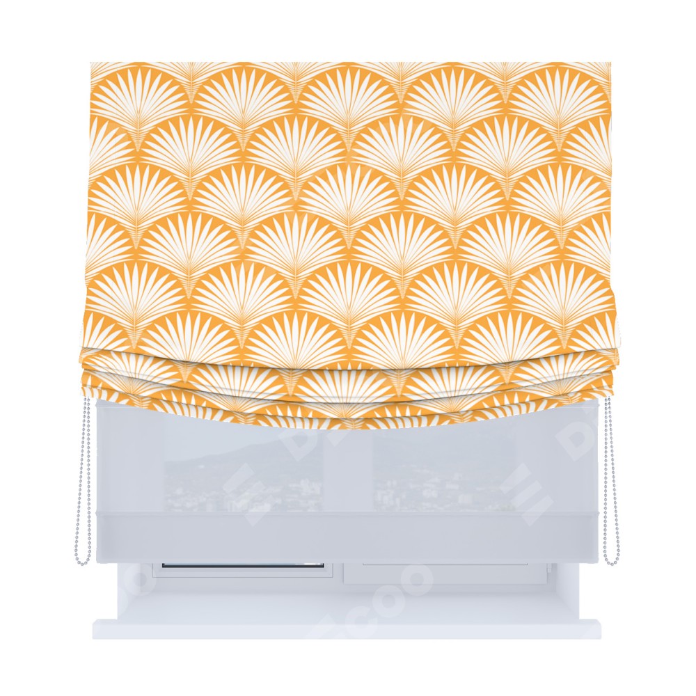 Римская штора день-ночь производителя «Cortin», используется для проёма, пошита из двух полотен, с лицевой блэкаут с нанесением сублимационной печати «Арт-деко листья желтый», вторая ткань тюль (по стандарту комплектуется тюль белого цвета артикул V-01). Имеет универсальный механизм и подходит для монтажа: на потолок, на стену и в нишу. Удобное управление каждой шторой отдельно.