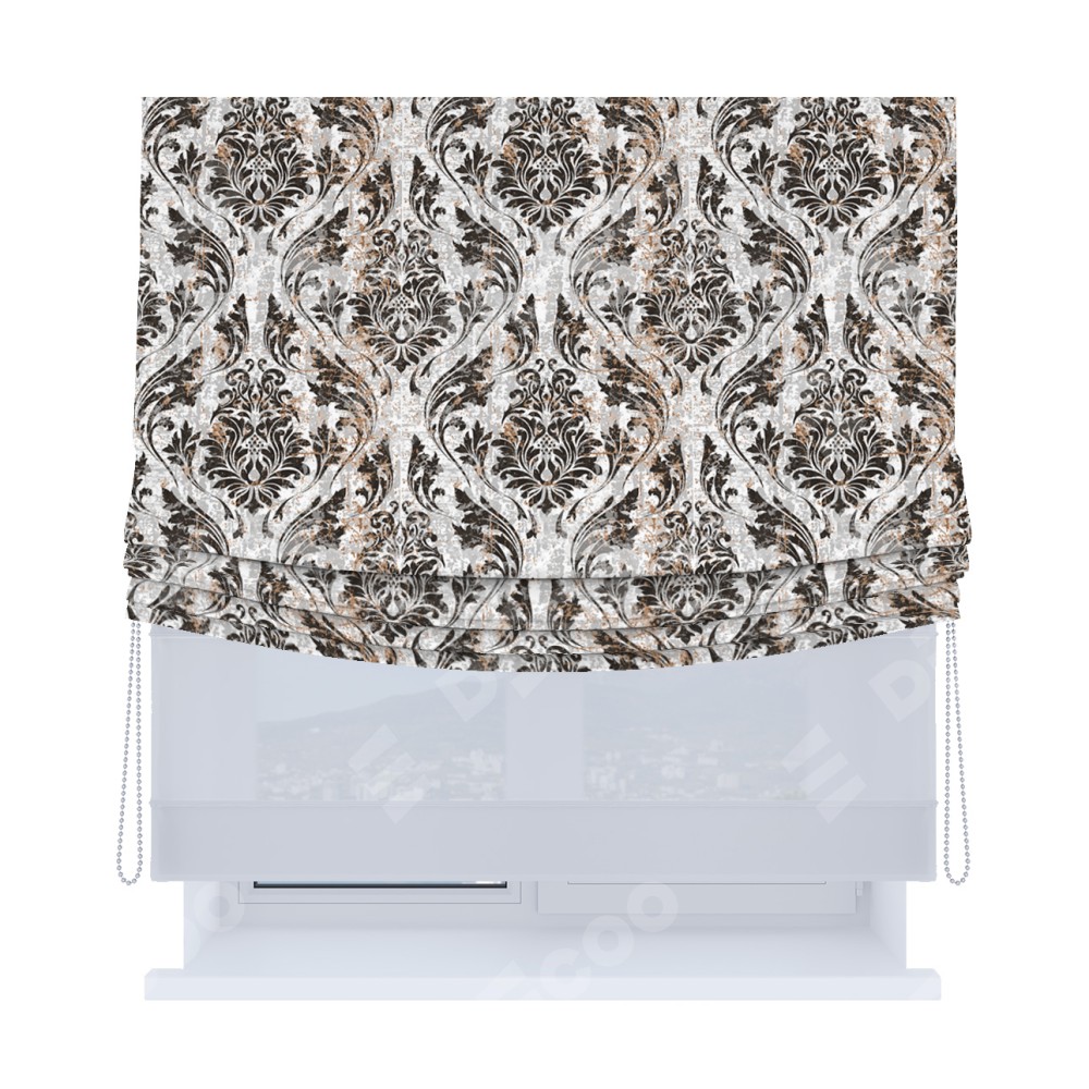 Римская штора день-ночь производителя «Cortin», используется для проёма, пошита из двух полотен, с лицевой блэкаут с нанесением сублимационной печати «Дамаск тёмный», вторая ткань тюль (по стандарту комплектуется тюль белого цвета артикул V-01). Имеет универсальный механизм и подходит для монтажа: на потолок, на стену и в нишу. Удобное управление каждой шторой отдельно.